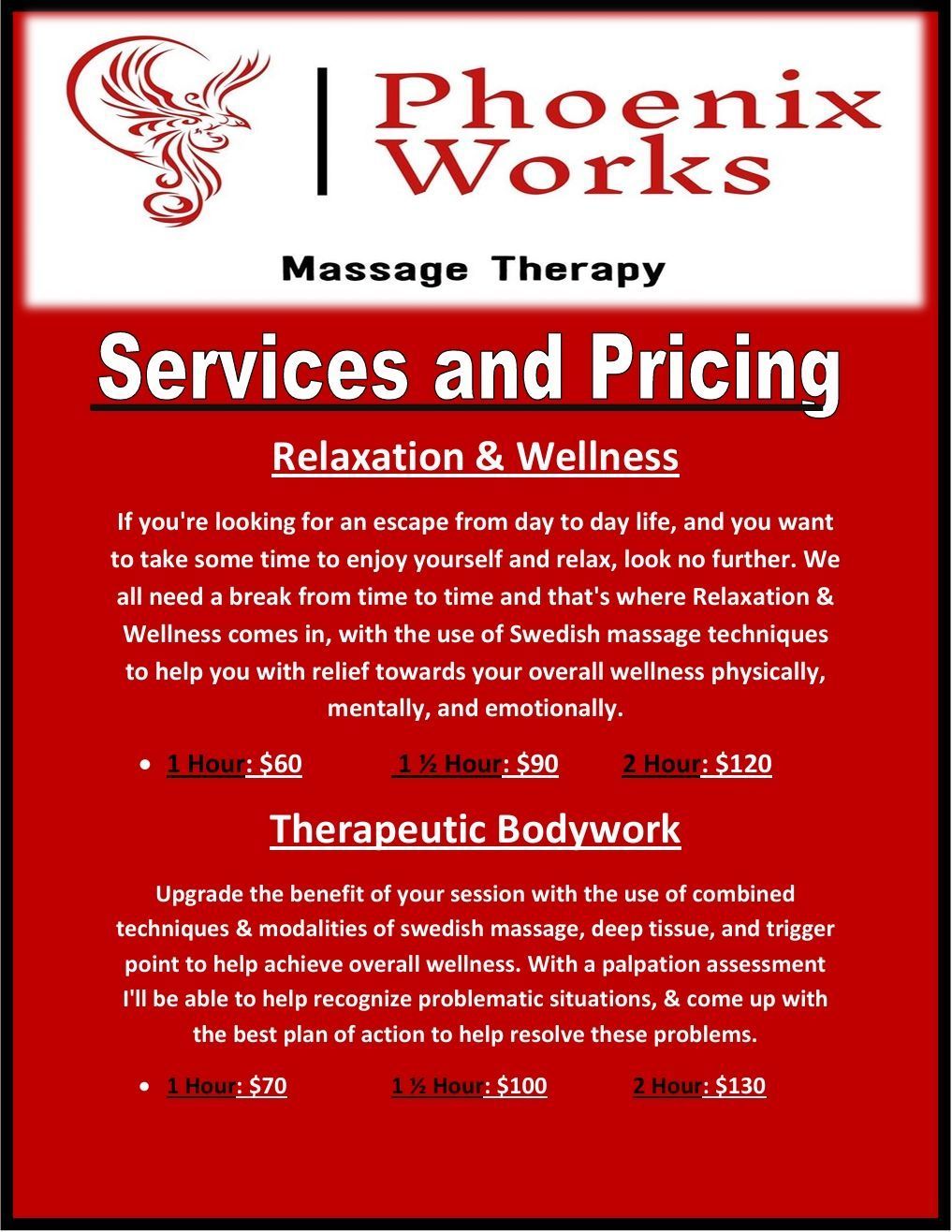 In-office and portable sessions are available to reach you for your therapeutic needs as well as business and social event opportunities. If you or a business are interested in any information you are welcome to reach out anytime through the contact information provided. Don't wait any further to improve your life, book a session now with Phoenix Works Massage Therapy.